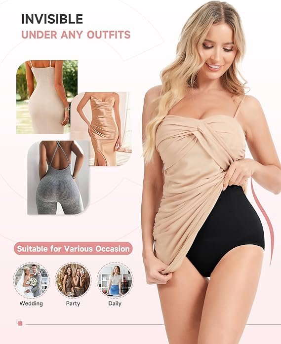 • Invisible Shapewear For Women: Crafted for total discretion,this under dress shapewear combines high waisted shapewear support with seamless shapewear construction that eliminates visible lines. Whether you’re heading to a party or spending a day at the office,the invisible finish ensures you stay smooth under even the tightest dresses or skirts. The fabric stretches to fit your unique shape while maintaining gentle compression,helping you feel secure and flawless from morning to night