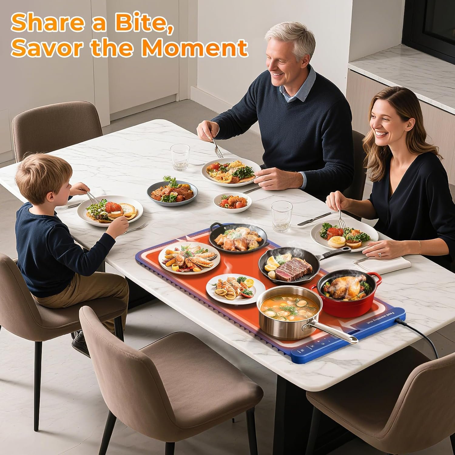 - 【Large & Space-Saving Food Warmer Mat】Made of food-grade silicone with nano-coated surface, this warming tray resists stains, oil, and spills for easy cleaning. Unfolded to 32″ x 15″ for large coverage, it rolls up compactly for neat storage or hanging—ideal for home and travel use.